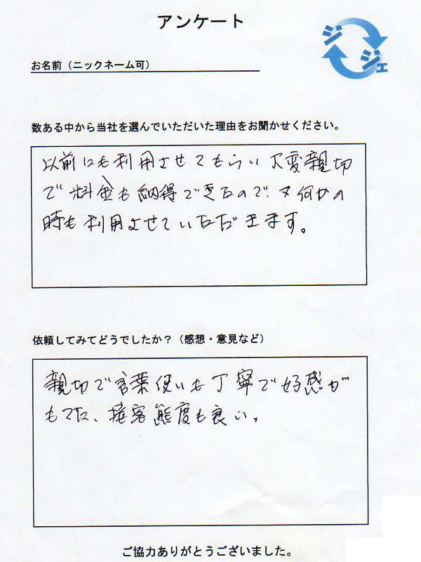 以前にも利用させてもらい大変親切で料金も納得出来たので又何かの時も利用させていただきます。親切で言葉使いも丁寧で交換がもてた接客態度もよい。