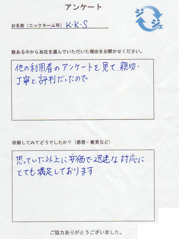 他の利用者のアンケートを見て、親切・丁寧と評判だったので。思って退場に安価で迅速な対応にとても満足しております。